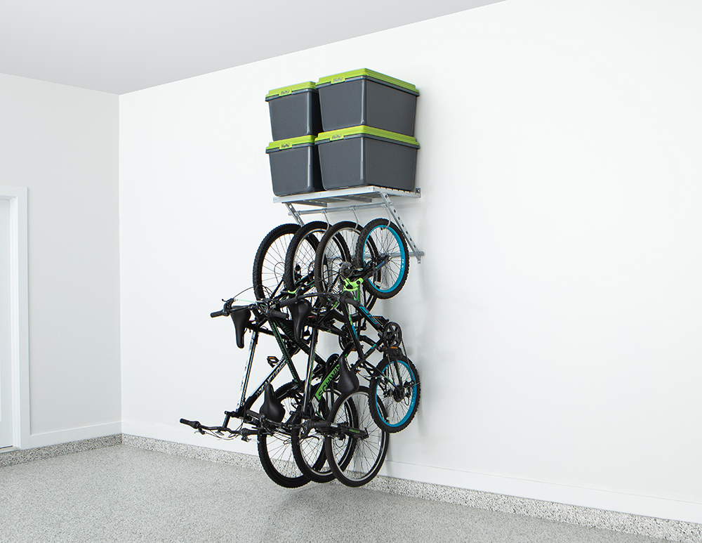 Store bike accessories or other outdoor gear on the 20-inch deep shelf above.