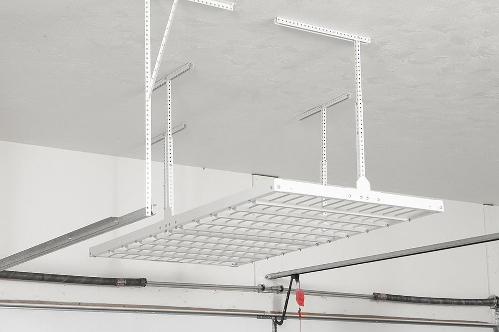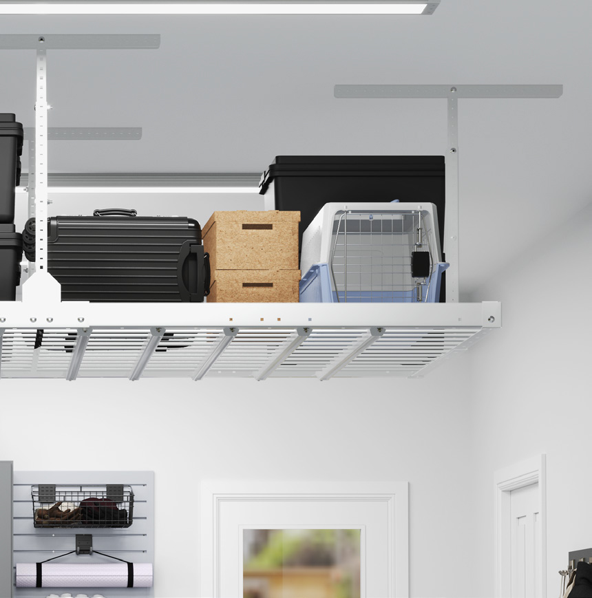 Look up! Our overhead racks are mounted to the ceiling above your garage door to maximize storage and make the most of every available inch.