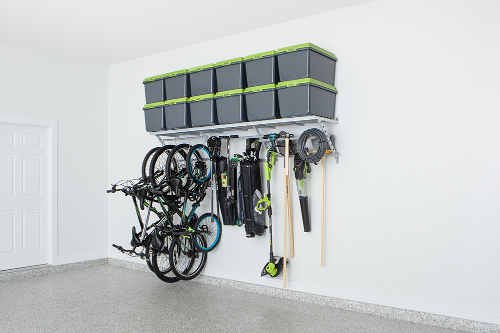 A winning combination of overhead storage and layered hanging organization below allows you to maximize the wall space in your garage, making the most out of your space.