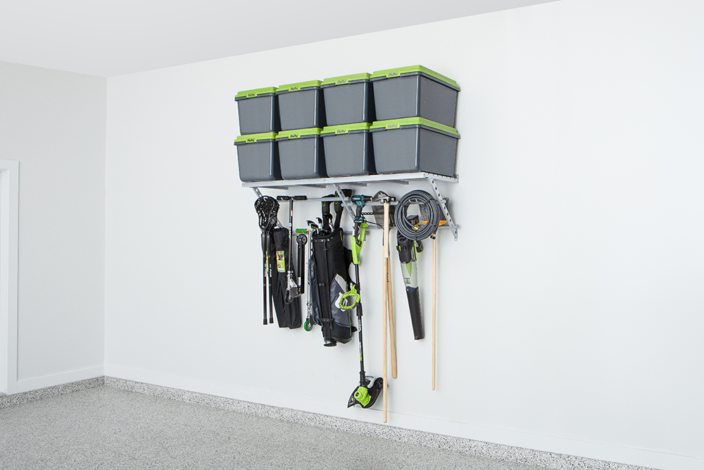 Maximize vertical space with the Garage Essentials Utility Kit. Store totes or other items on the 20-inch deep shelves while you hang frequently used items from the bars beneath.
